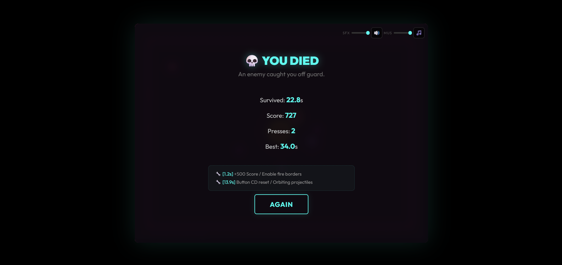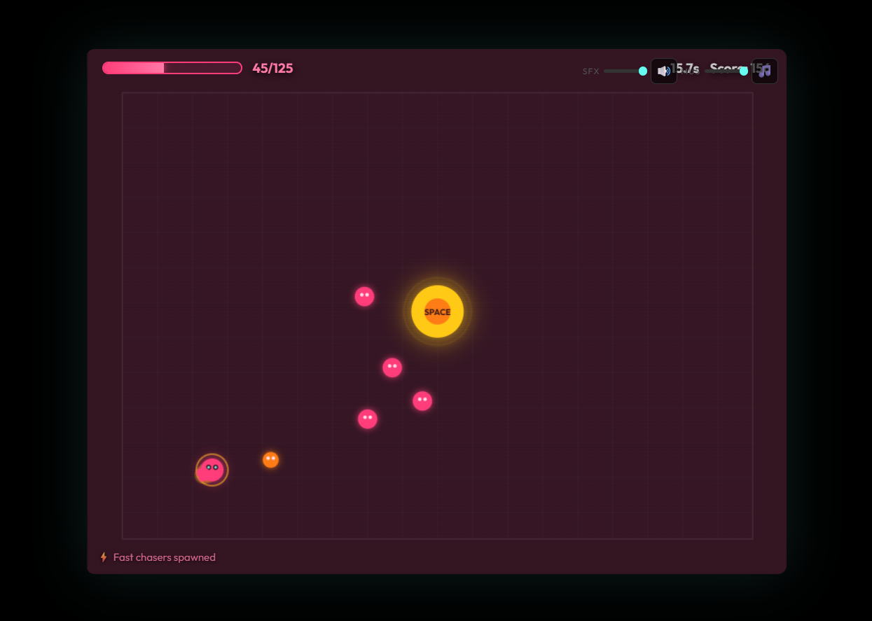 Every Press Hurts is a fast arcade survival game about making bad choices on purpose. Dodge hazards, stay alive, and run to the center button when things get rough. Every option helps you, but also makes the game more dangerous. Move with WASD or Arrow Keys, press Space near the button, choose your curse, and survive as long as you can.