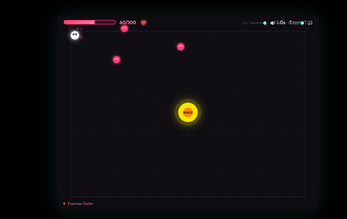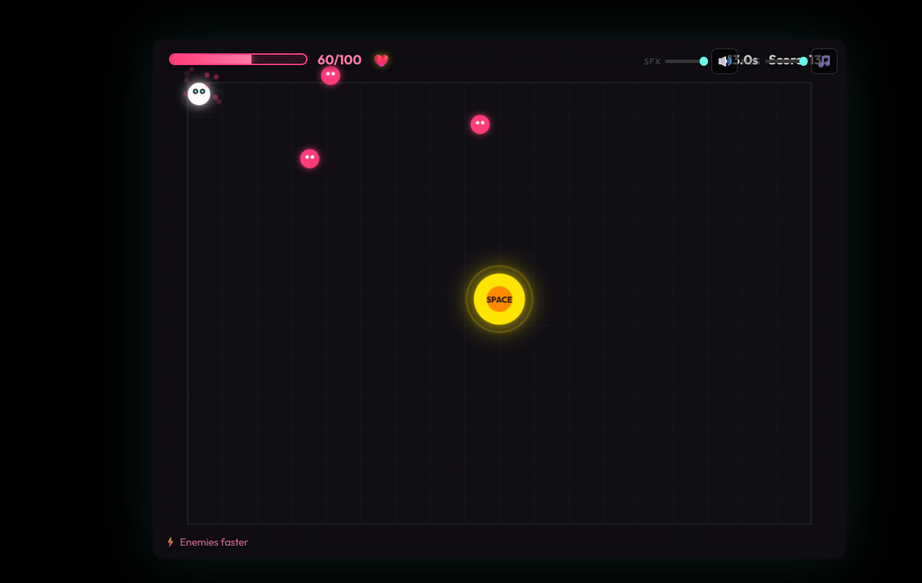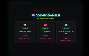 You move around a neon arena, dodge enemies and hazards, and try to stay alive as long as possible. In the middle of the arena is a button. When the situation gets bad, you can run to it and press it for help. The catch is that every choice gives you a benefit and a downside. You might heal, freeze hazards, or gain an extra life — but at the same time enemies may get faster, lasers may appear, or movement may get worse.